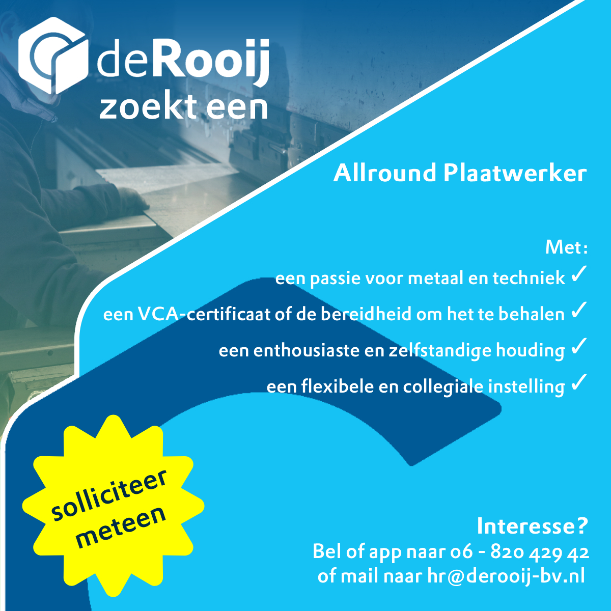 Als allround plaatwerker bij De Rooij ben je verantwoordelijk voor het produceren van het plaatwerk voor onder andere afvalverwerkingsmachines en ondergrondse containers. De werkzaamheden bestaan vooral uit het knippen, kanten, tappen en boren van plaatwerk, het bedienen en instellen van de CNC kantbank, het zelfstandig maken van de producten en het afronden van de plaatbewerking.