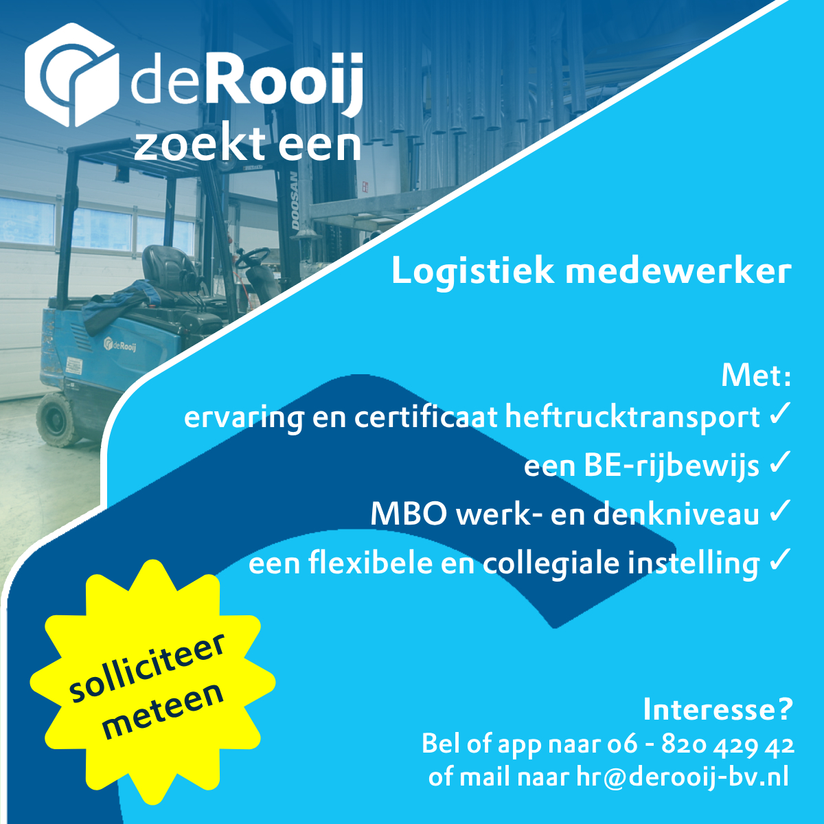 Bel of stuur een appje naar 06-82042942 of mail naar hr@derooij-bv.nl met jouw contactgegevens. Wij proberen dan zo snel als mogelijk met jou in contact te komen.