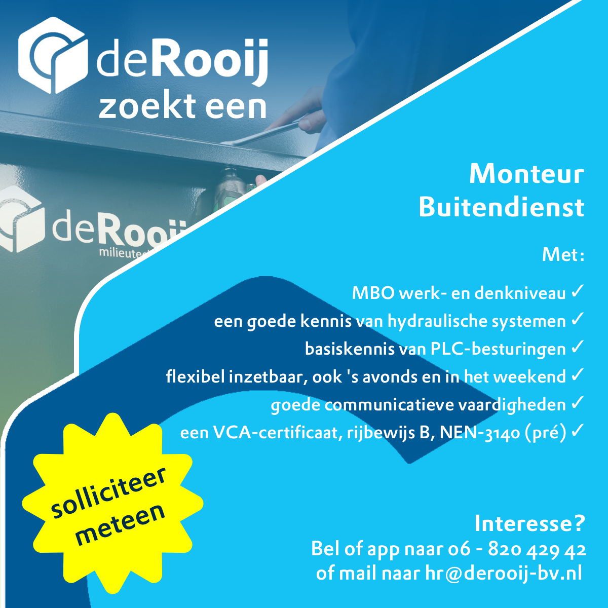 Als monteur buitendienst bij De Rooij ben je verantwoordelijk voor het installeren, oplossen van storingen en plegen van onderhoud aan onder andere afvalverwerkingsmachines en ondergrondse containers. In een zelfstandige en diverse baan vergroot je de tevredenheid bij klanten door het optimaal laten functioneren van hun producten en door alle voorkomende complexe en technische vraagstukken op te lossen.