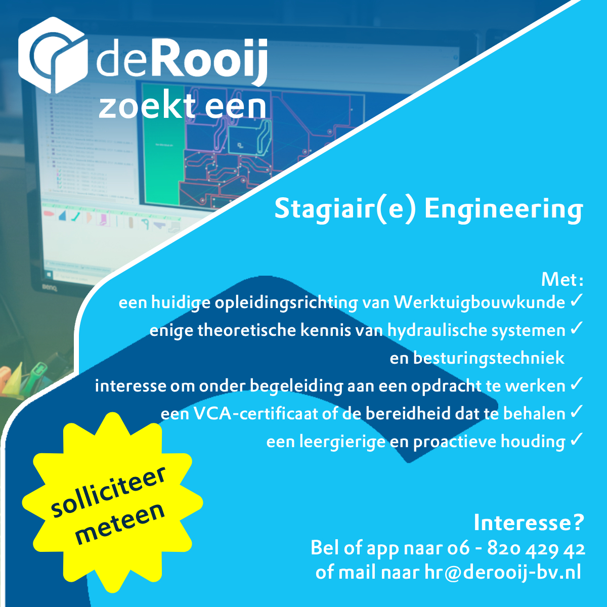Als stagiaire engineering bij De Rooij leer je alles over het uitwerken van machines met behulp van SolidWorks en AutoCAD. Je leert om zelfstandig het gehele ontwerp van een nieuwe opdracht of deel van een opdracht uit te werken, inclusief de schema’s en tekeningen. Volg jij een HBO in de richting van Werktuigbouwkunde en zoek je een uitdagende stageplaats in de engineering?